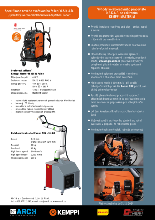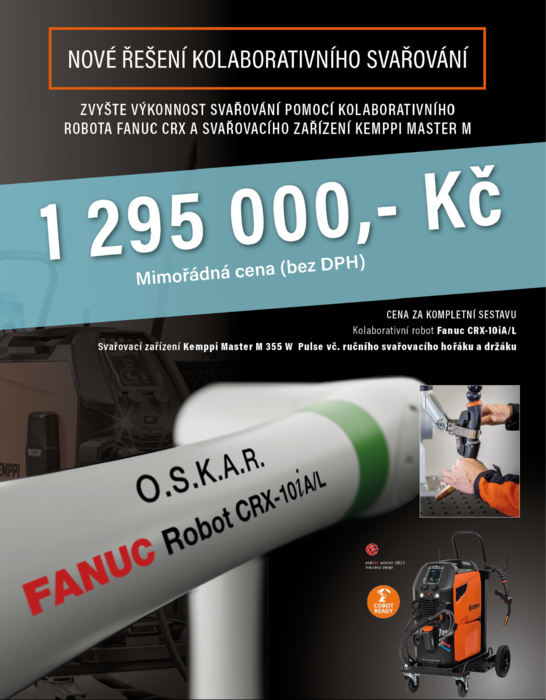 Vážení obchodní přátelé, jsme nadšení, že vám můžeme představit nové unikátní provedení našeho oblíbeného řešení kolaborativního svařovacího robota O.S.K.A.R. - "Opravdový, svařovací, kolaborativní, adaptabilní robot".